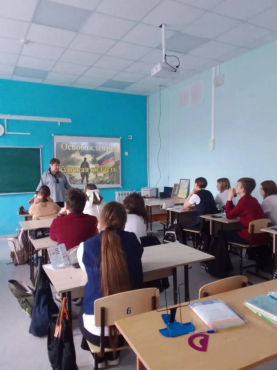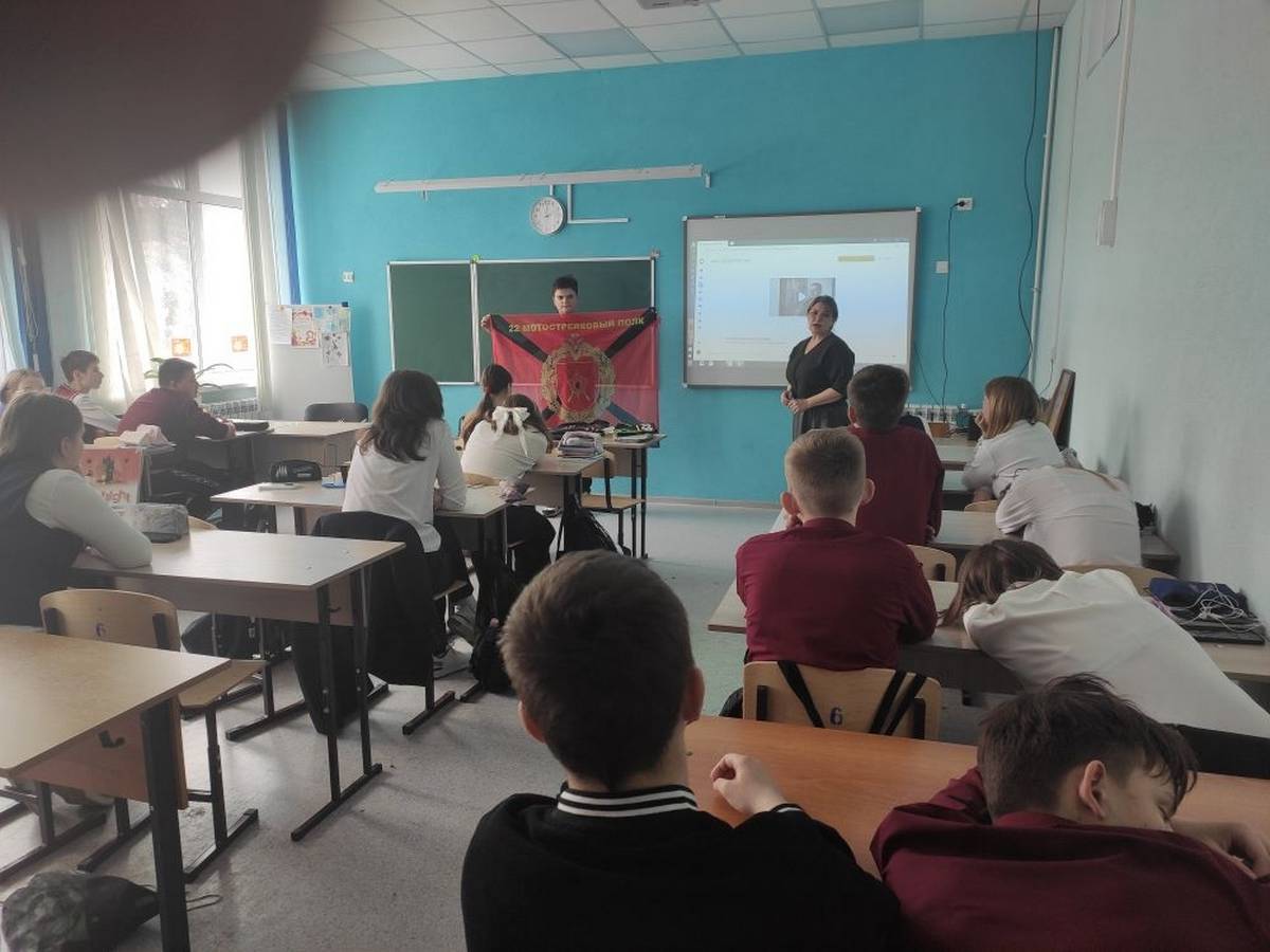 Флаг этой бригады и других подразделений бойцы вручили волонтёру Юлии Волобуевой за помощь участникам СВО. Её сын Тимофей учится в этом классе, он продемонстрировал ребятам эти стяги.