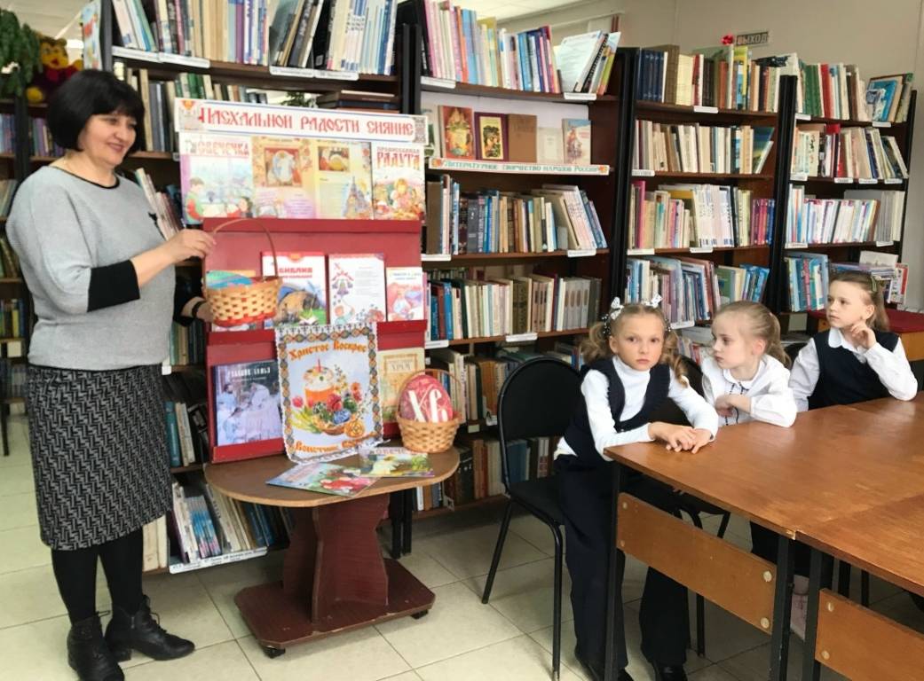 В начале мероприятия библиотекарь познакомила детей с историей возникновения праздника Пасхи, с традициями, обычаями и обрядами. Затем каждый участник встречи рассказал о том, как в его семье отмечают Пасху, поделился секретами украшения пасхальных яиц. Была оформлена выставка-просмотр «Пасхальной радости сияние», где представлена литература о жизни Иисуса Христа, духовная литература и художественные произведения о Пасхе и праздничная композиция, которая знакомила с основные атрибуты Пасхи: куличи, крашеные яйца, пасхальные полотенца.
