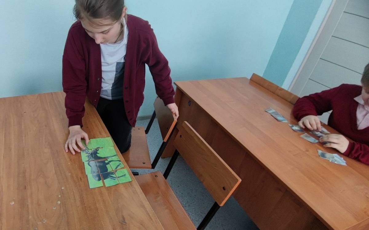 Учащиеся с интересом отвечали на «лесные» загадки и отлично показали себя в собирании пазлов, на которых оказались изображены самые распространенные на территории заповедника виды животных – кабан, лось, лисица, барсук.