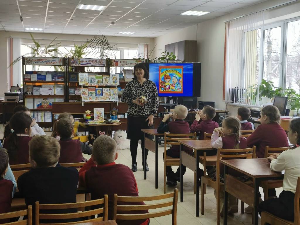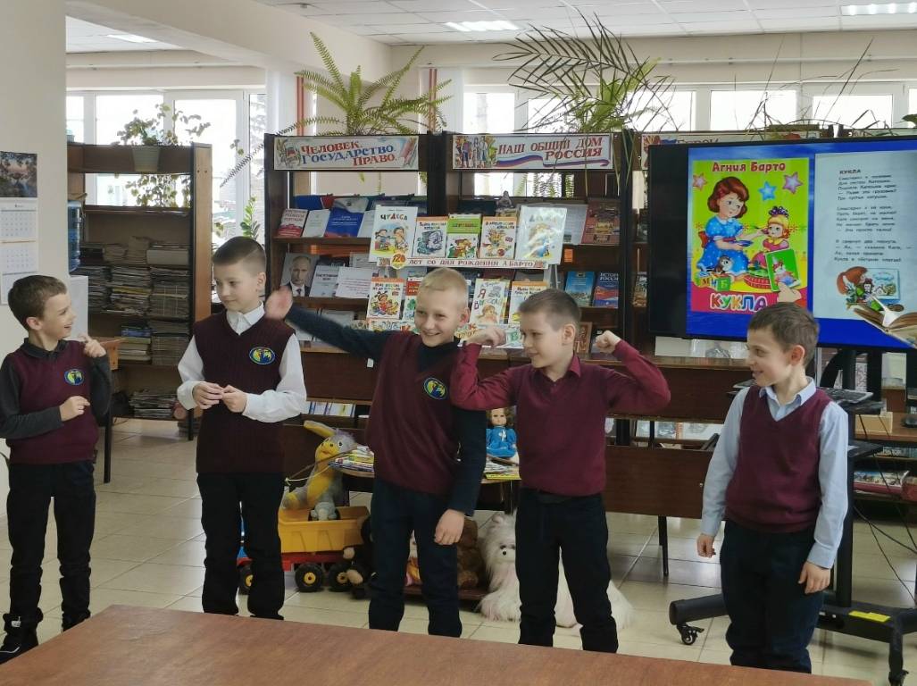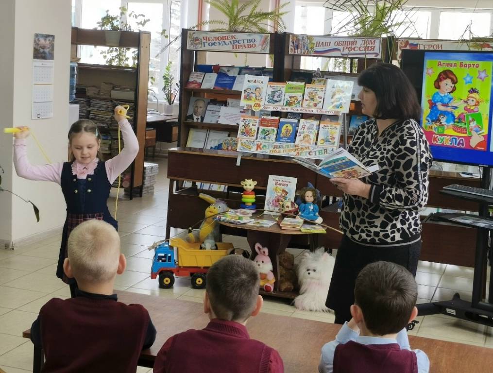 На час детской поэзии «Кораблик под парусом детства» к 120- летию со дня рождения известной детской поэтессы А. Л. Барто мы пригласили второклассников ФСОШ №2. Познакомить детей с жизнью и творчеством А. Барто помогла выставка-экспозиция «Читаем вместе» и видеопрезентация «Чьи стихи мы знаем с детства». Весело прошла игра «Продолжи строки». Особенно понравился мальчикам и девчонкам конкурс «Инсценировка стихотворений». В шуточной форме ребята изобразили героев стихотворений «Модница», «Любитель-рыболов», «Митяй-лентяй», «Веревочка». Дети познакомились со стихотворениями о природе, которые собраны в разделе «Из пестрых страниц», посмотрели отрывок мультфильма «Снегирь», собрали пазлы, узнав героев произведений А. Барто.