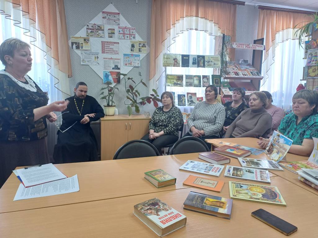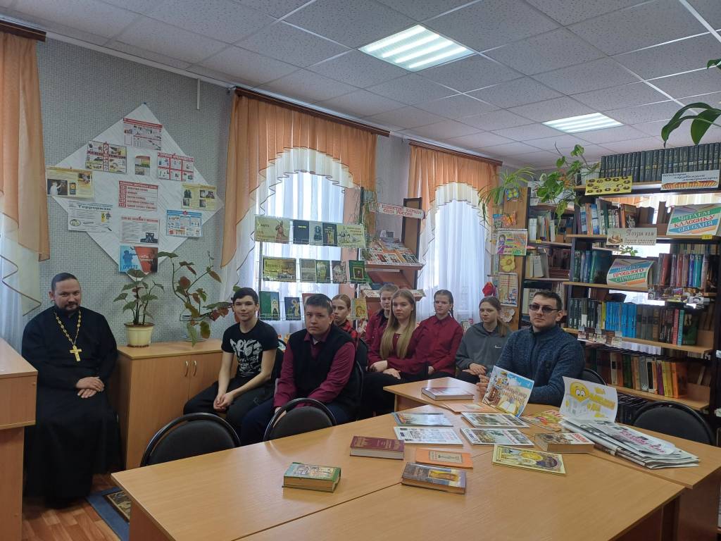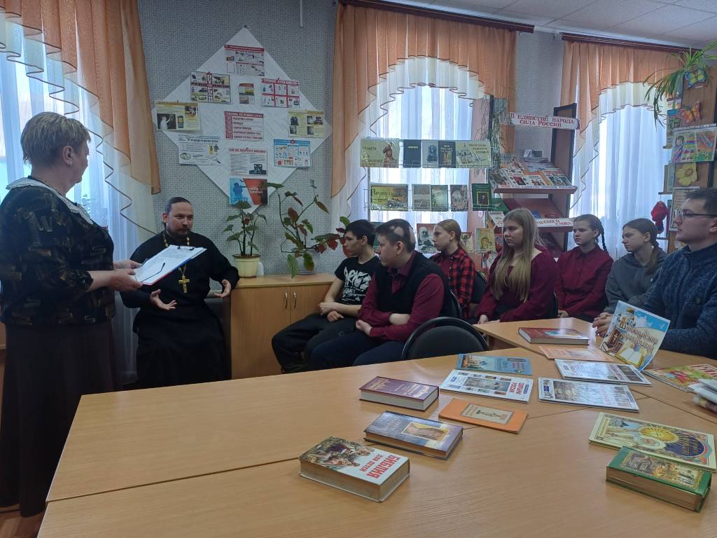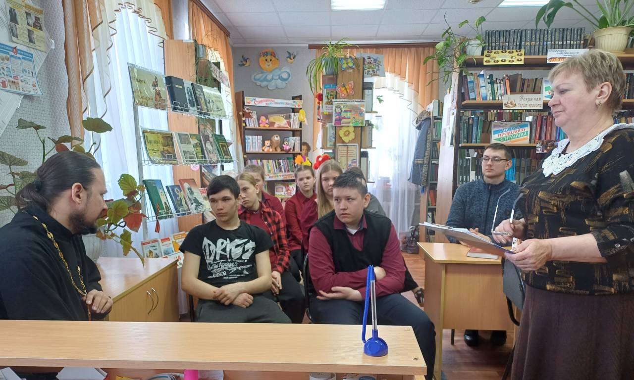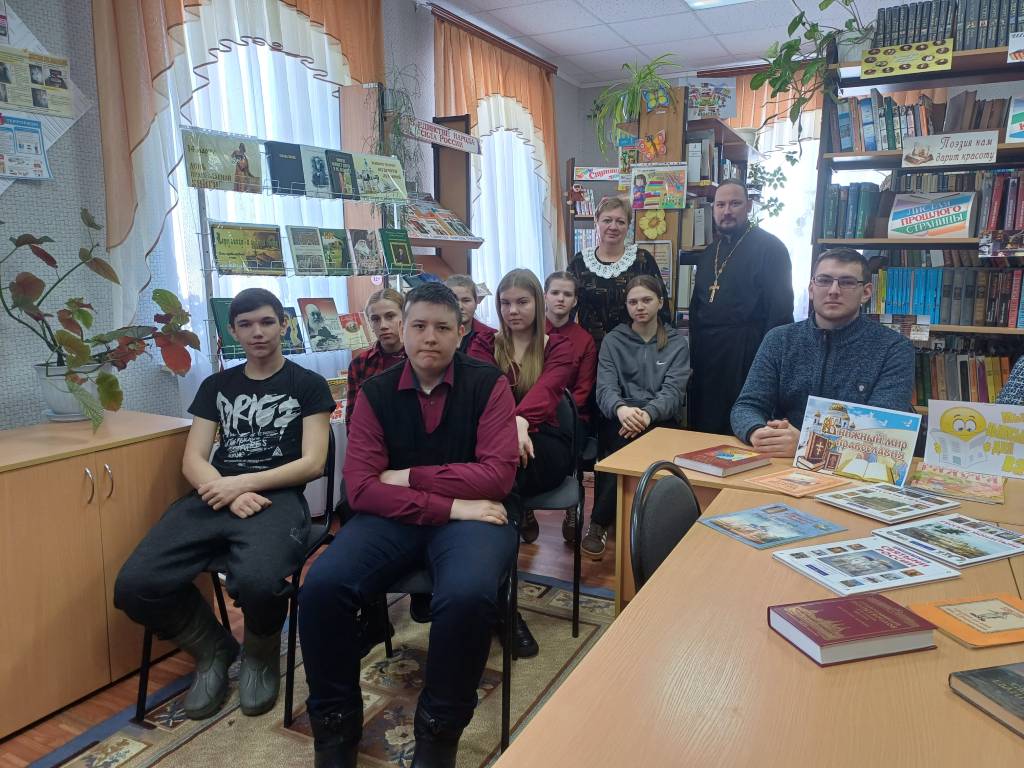 13 марта в Большеанненковской сельской библиотеке провели душеполезные чтения «Добрый мир любимых книг». Мероприятие проходило в форме беседы с священником. Члены клуба «Сила духовного слова», учащиеся 8-9 классов Большеанненковской школы, читатели библиотеки познакомились с историей праздника и главный гость – настоятель Богоявленского храма иерей Димитрий.