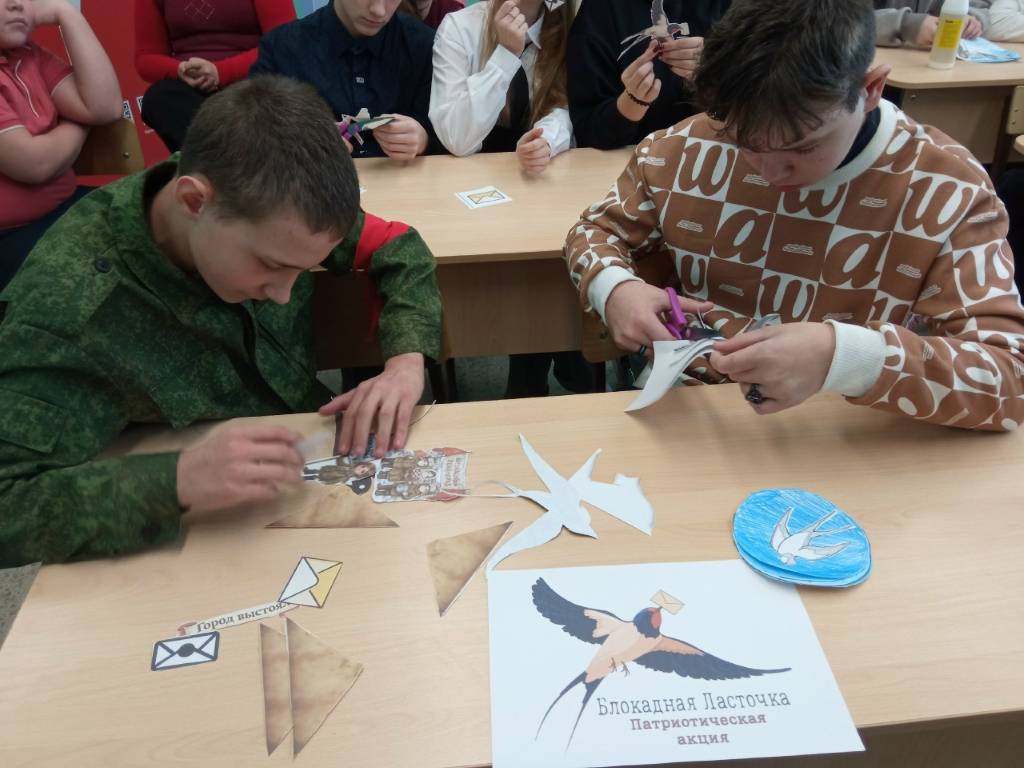 Совместно с советником директора по воспитанию МКОУ «Солдатская ООШ», Пряхиной М. А. для школьников 5 - 9 классов был организован и проведен мастер-класс «Блокадная ласточка - символ надежды».