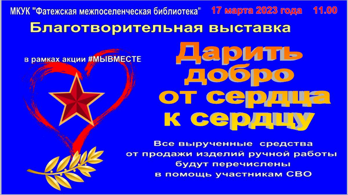 17 марта 2023 года в 11.00 часов в читальном зале Фатежской межпоселенческой библиотеки в рамках акции #МЫВМЕСТЕ проводится благотворительная выставка «Дарить добро от сердца к сердцу», где будут представлены изделия, сделанные с любовью умелыми руками слушателями факультета «Домоводство» Университета старшего поколения.