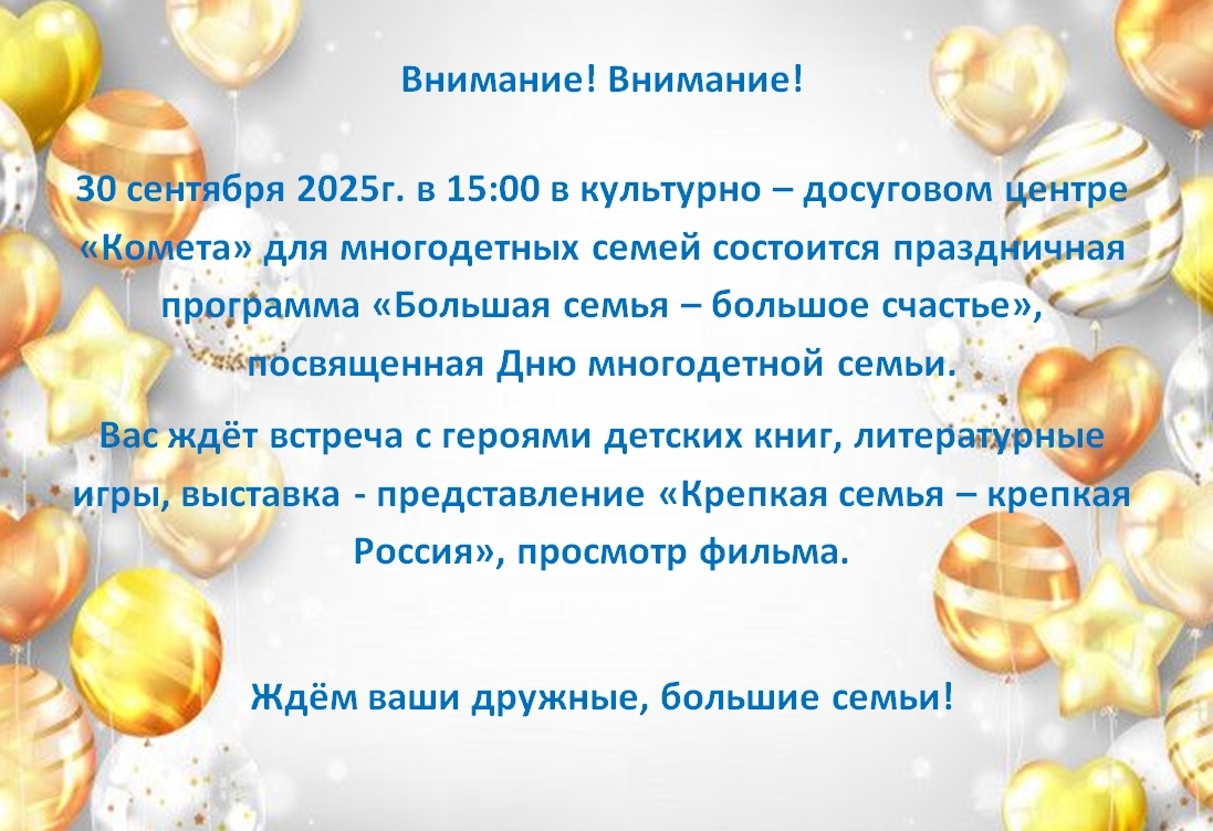 30 сентября 2025 г. в 15:00 состоится праздничная программа «Большая семья - большое счастье»