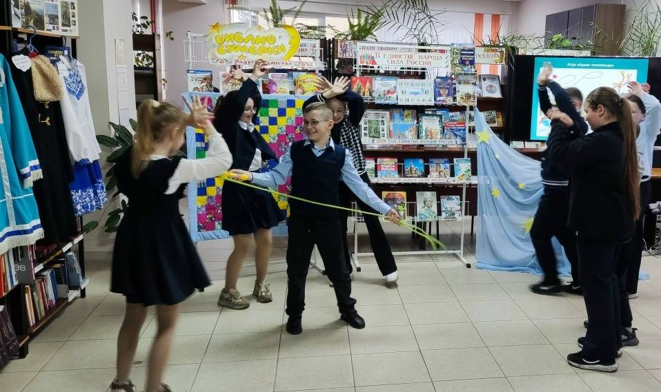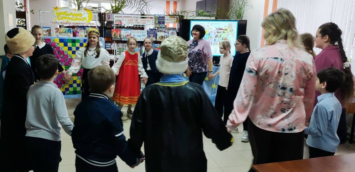 Школьники побывали в разных уголках нашей Родины, познакомились с традициями и обычаями народов, литературой и устным народным творчеством. Дети узнали, что в нашем государстве живут около 190 народов, каждый со своей уникальной культурой, языком и традициями, что, несмотря на различия, на протяжении веков в мире и согласии живут люди разных национальностей и всех их объединяет одно – крепкая дружба, взаимное уважение и общее стремление к миру и развитию. Весело прошли игры: русская «Ручеек», татарская «Горячая картошка», дагестанская «Подними платок», ненецкая «Аркан оленевода». Игры проходили под мелодии народов России, что позволяло проникнуться их культурой и традициями.