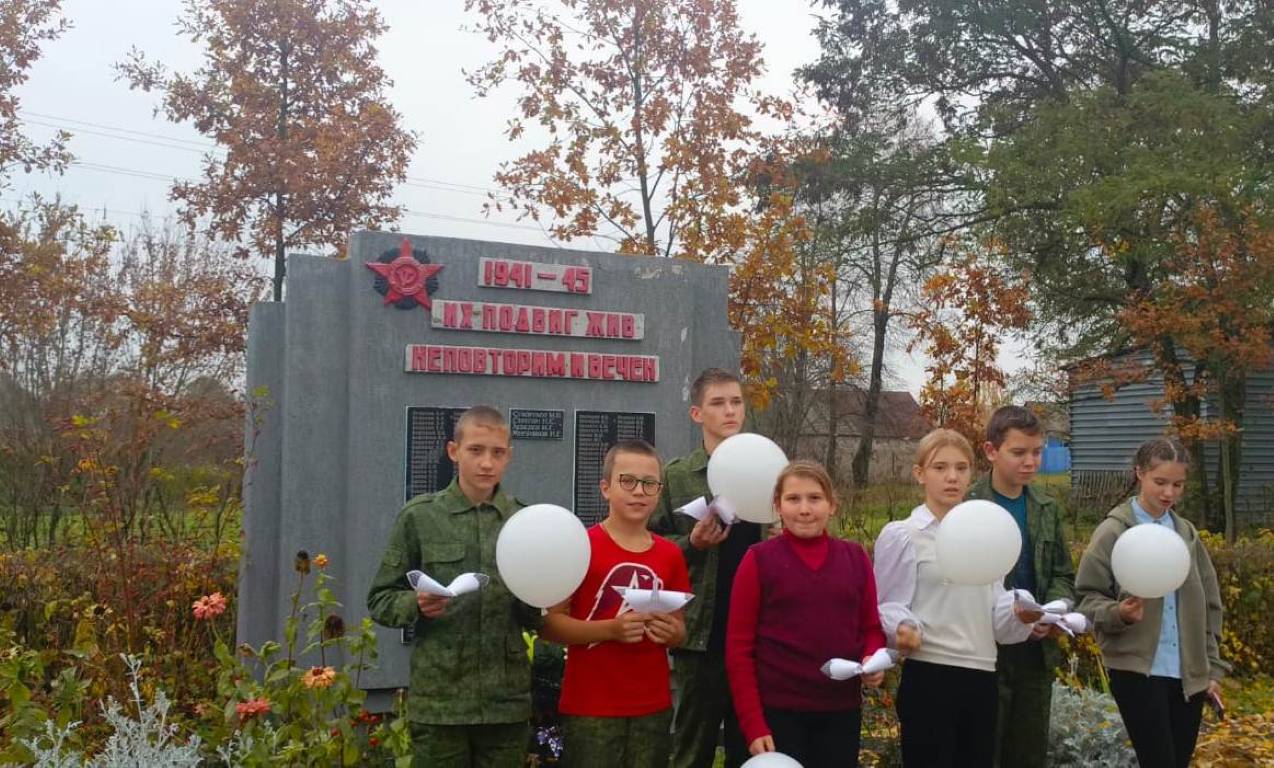 В память о тех, кто отдал свои жизни за будущее, ребята сделали из бумаги белых журавлей и разместили их у памятника войнам-землякам.
